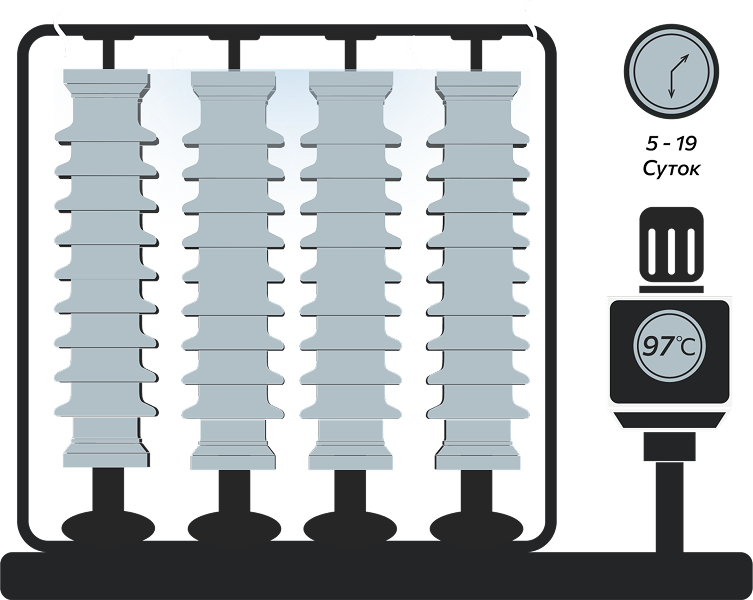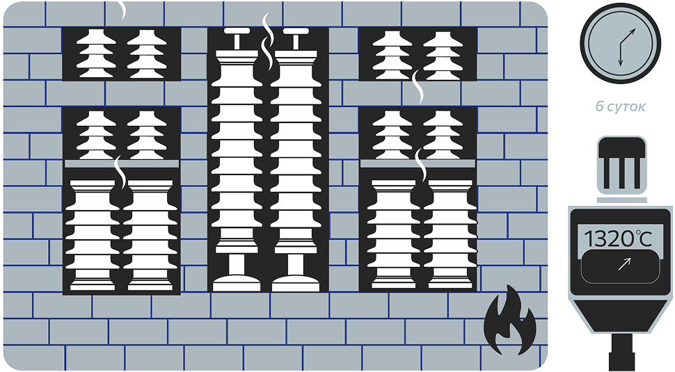 Изоляторы обжигаются в туннельных и камерных печах. Продолжительность обжига — около 6 суток.